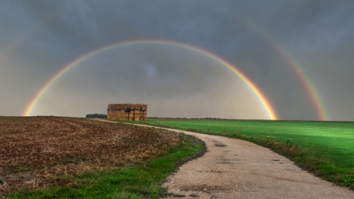 Altri tag (senza riscontro): alberi, doppio, curve, paglia, marrone, iride, sterrata, arcobaleni, catasta, rotoli, panorama, coltivazione, nuvoloso, ghiaia, terreno.
