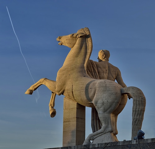 Altri tag (senza riscontro): eur, colonna, tramonto, architettura, prospettiva, testa, quadrupede, persona, impennato, statue, celeste, eroe, zoccoli, piedistallo.