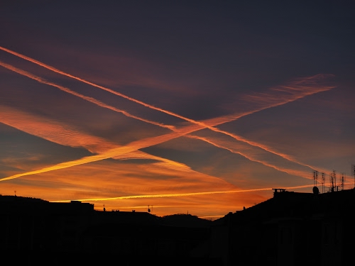 sono una serie di scie provocate dalle rotte degli aerei che si sono incrociati, formando una ics illuminata dal sole che stava nascendo