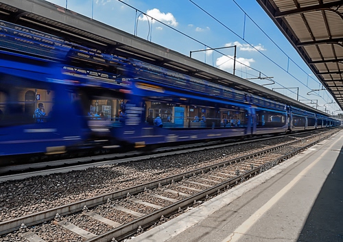 Tag: treno, stazione, binari, blu, ferrovia, rotaie, binario, fili, velocità.
