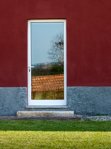 Tag: porta, riflesso, prato, gradino, vetro, erba, scalino, rosso, verde.