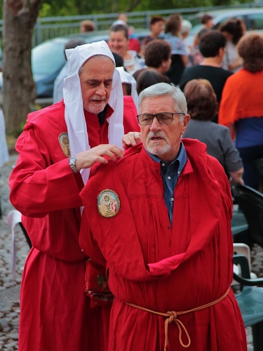 Confratelli di un confraternità montellese, si aiutano reciprocamente ad indossare il tradizionale costume