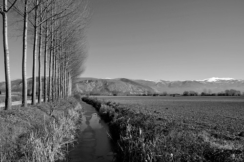 Tag: alberi, montagne, cielo, canale, acqua, erba, inverno, campagna, bianconero, torrente, strada, terreno, rami, arato, tronchi, neve, grigio, fila, filare, fiume, panorama, fosso.