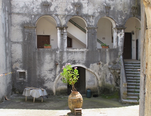 Cortile di palazzo nobiliare a Tortora (Cosenza) sul cui ingresso si trova la targa che ricorda che Garibaldi drmì una notte qui nella sua risalita dell'Italia.