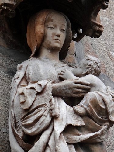 La Vergine Maria che allatta il Bambino Gesù , statua posta all'esterno sul lato posteriore della Cattedrale di Braga - Portogallo.
