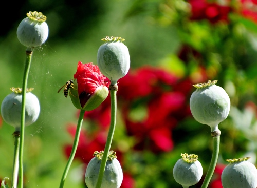 Una bella metafora della popolazione che sta invecchiando... Un solo bocciolo che si sta aprendo e tante capsule seminali, cioè papaveri già sfioriti... Se posso darti un consiglio... taglia le tre capsule sotto, la foto acquisterebbe in leggilibità. Less is more. |