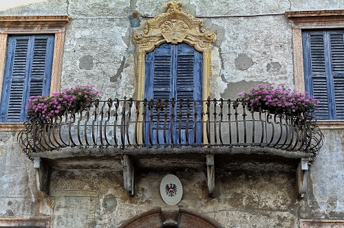 Tag: balcone, finestre, fiori, stemma, ringhiera, vasi, porta, rosa, persiane, blu, muro, ferro, azzurro, casa, decorazioni, imposte.