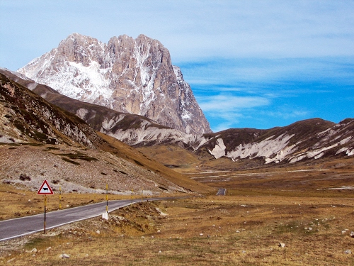 Tag: montagna, strada, cielo, cartello, nuvole, segnale, bianco, neve, azzurro, montagne, segnaletica, roccia, triangolo, dolomiti, abruzzo.