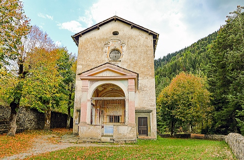 Tag: alberi, chiesa, cappella, prato, rosone, cancello, porta, bosco, arco, verde, nuvole, cielo, autunno, erba, muretto, foglie, chiesetta.