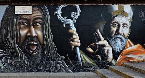 Altri tag (senza riscontro): capigliatura, maligno, dente, bene, occhio, grigio, benedice, neri, arancione, religione, benedizione, espressione, volto, graffito, demone, male, attila, lingua, gesto, mitria, diavolo, pontefice, capello, urlo, santo, cartello, figure, scalini, dito, scettro, due, terrore, scalinata, mani, visi, malvagio, parete.