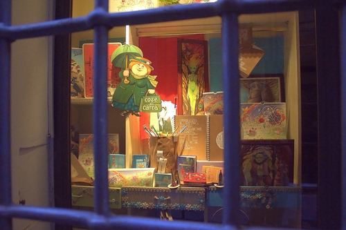 Tag: vetrina, carta, inferriata, cartoleria, grata, ombrello, finestra, luci, quaderni, libri.