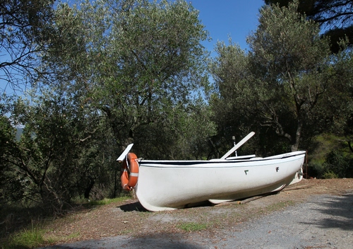 Tag: barca, alberi, salvagente, bianco, strada, verde, cielo.