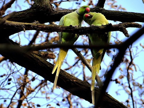 Tag: pappagalli, rami, albero, verde, uccelli, tenerezza, due, becchi, piume, code, coppia, foglie, becco, verdi, coda, rosso, penne, ali, cielo, amore.