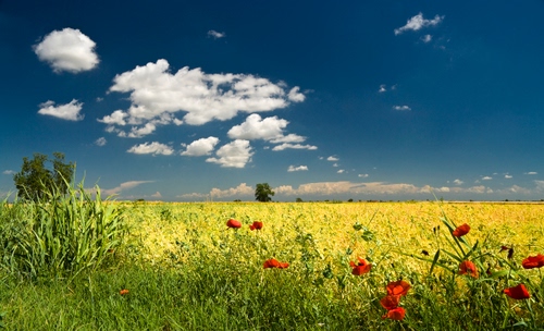 Tag: papaveri, nuvole, cielo, campo, erba, fiori, alberi, campagna, verde, giallo, bianco, azzurro, rosso, panorama, grano, prato, piante.