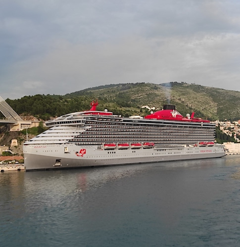 Tag: nave, crociera, mare, rosso, collina, fumo, bianco, acqua, porto, prua, finestrini, passeggeri, ponti, case, colline, nuvole, cielo, cabine, barche, scialuppe.