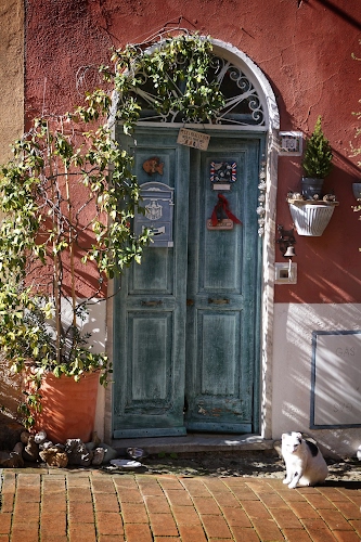 Tag: gatto, porta, pianta, uscio, portone, rampicante, verde, legno, arco, vasi, piante, muro, campanello, vaso, casa, numero, cassetta, bianco, piastrelle, soglia, ingresso, gradino, lettere.