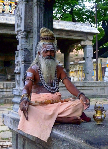 Un sadhu in meditazione all'esterno di un tempio