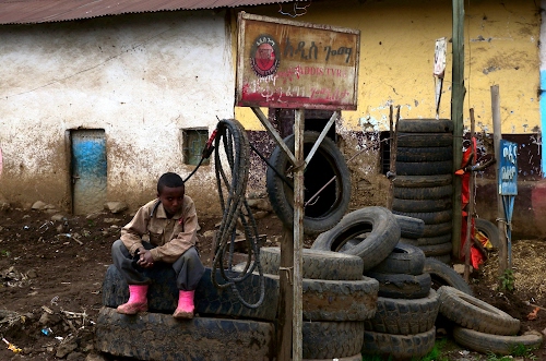 Un ragazzino etiope aspetta i clienti davanti a una catasta di pneumatici