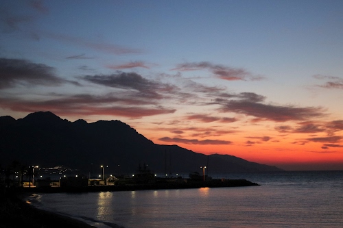 Tag: tramonto, mare, luci, nuvole, cielo, montagne, rosso, costa, riflessi, lampioni, alba, acqua.