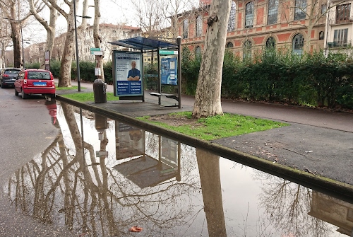 Foto dell'autore marivodo candidata al contest fotografico pozzanghera su Dizy. Data inserimento: sabato 1 febbraio 2025. Titolo: Fermata di autobus con pozzanghera