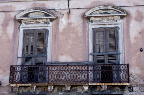 Tag: balcone, ringhiera, finestre, persiane, due, porte, archi, facciata, abbandono.