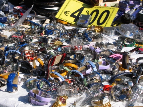 Orologi a buon mercato e ciarpame vario sulla bancarella di un mercato milanese.