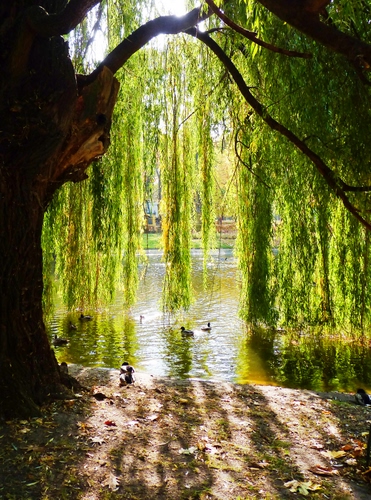 Bello il verde del salice piangente illuminato dal sole. |
