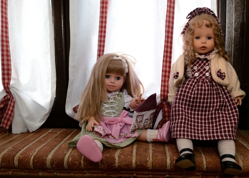 Tag: due, bambole, finestra, tende, davanzale, tenda, capelli, vestiti, giocattolo.