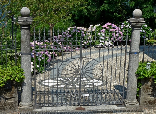 Tag: cancello, colonne, fiori, ingresso, ferro, cerchio, giardino, chiuso, sfere, viale, alberi.