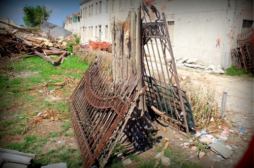 La foto è scattata da un foro di una rete protettiva in plastica, se ne nota un angolo a destra, quello che ho ripreso nella foto sono i resti del cancello e cancellata di villa Fini completamente rasa al suolo da una tromba d'aria a Dolo (ve) sulla Riviera del Brenta. |
