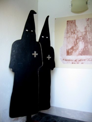 Le due figure sono poste all'ingresso del Museo di una Confraternita della città di Imperia. All'interno sono esposte le cappe originali, sia bianche che nere, e altri oggetti molto interessanti nonché opere d'arte di vario genere. Si trova in una località, il Monte Calvario,da cui si gode una meravigliosa vista della città.