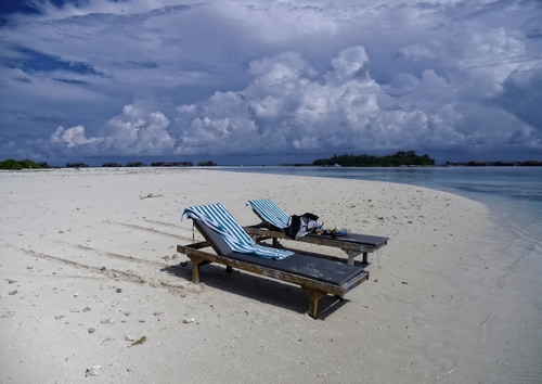 Tag: mare, spiaggia, nuvole, sabbia, lettini, due, cielo, acqua, sdraio.