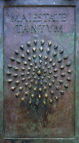 I cartigli sul basamento (segnato da due ampie specchiature in granito rosso), opera interamente di Pietro Tacca, risalgono invece al 1640. In quello che guarda alla basilica è raffigurata l'originale impresa araldica di Ferdinando I, formata da uno sciame d'api con il motto "MAIESTATE TANTUM". L'ape regina è contornata, a cerchi concentrici sfalsati, dalle altre api dell'alveare, per cui rimane difficile contarne il numero senza confondersi. La simbologia dell'impresa è allusivamente molto chiara: il granduca al centro (l'ape regina) che non incute nessun timore, attorniato dal pacifico popolo fiorentino rappresentato dalle api operose (informazioni prese da WIKIPEDIA)