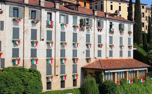 Tag: finestre, bandiere, palazzo, persiane, tricolore, comignoli, tetto, verde, case, alberi.