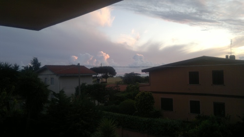 Tempesta fragorosa appena cessata, aria ancora gocciolante mentre il sole sceso sul mare riappare fugacemente fra le nuvole ormai scaricate di pioggia.