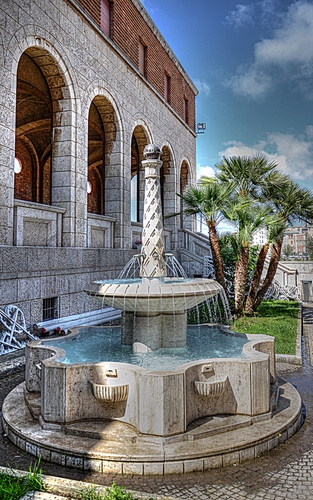 Tag: fontana, acqua, archi, cielo, palme, zampilli, nuvole, palazzo, piante, alberi, finestre, palma, verde, colonne, azzurro, vasca.