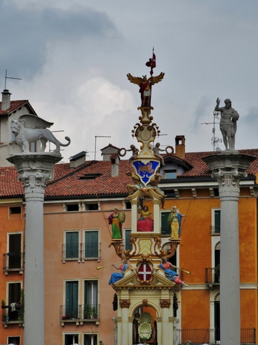 La "Festa dei oto". L'otto settembre è la festa della Madonna di Monte Berico. Questa macchina è "La Rua" (La Ruota) misto sacro e profano (notare quella specie di conchiglia in basso nella foto, dove si sedevano i bambini - ce n'erano quattro-portando il tutto in processione per la città. Questa è una ricostruzione che, da qualche anno, viene esposta in piazza nei giorni precedenti e successivi la festa. |