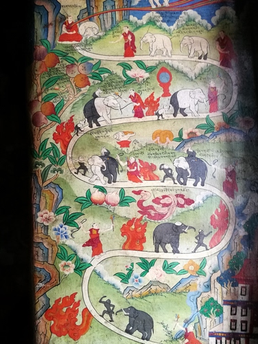 Mi sembra di ricordare che sia una colonna o un pannello decorato. È in un tempio buddista del Ladakh, fotografato un anno fa in un meraviglioso viaggio nel nord est dell’India. L’uomo è l’elefante perdono Il colore nero man mano che la meditazione progredisce, e la scimmia (simbolo della vacuità terrena) scompare. La mia tecnica fotografica ha molte lacune e non riesce a rendere al meglio la bellezza del disegno. Sto cercando di migliorare. Grazie per la tua attenzione. Ti auguro una buona giornata. |