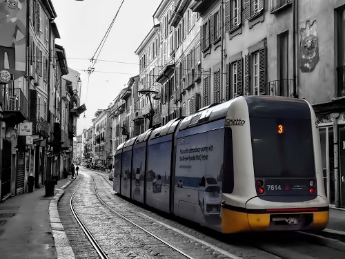 Altri tag (senza riscontro): tramvia, marciapiede, vetture, stemma, grigio, binario, rotaia, luce, porte, scorcio, selettivo, insegne, riflessi, elettrici, arancione, pantografo, persone.