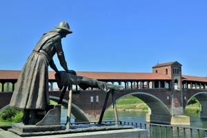 pavia il ponte coperto sul ticino e la statua della lavandaia