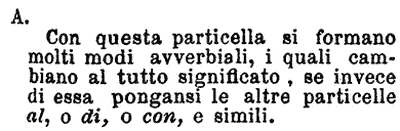 | A - Con questa particella si formano molti modi avverbiali, i quali cambiano al tutto significato, se invece di essa pongasi le altre particelle al, o di, o con, e simili. [immagine] |