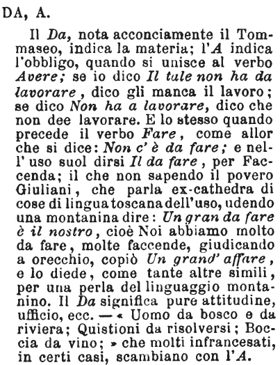 | Da, a - Il Da, nota acconciamente il Tommaseo, indica la materia; l'A indica l'obbligo, quando si unisce al verbo Avere; se io dico Il tale non ha da lavorare, dico gli manca il lavoro; se dico Non ha a lavorare, dico che non dee lavorare. E lo stesso quando precede il verbo Fare, come allor che si dice: Non c'è da fare; e nell'uso suol dirsi Il da fare, per Faccenda; il che non sapendo il povero Giuliani, che parla ex-cathedra di cose di lingua toscana dell'uso, udendo una montanina dire: Un gran da fare è il nostro, cioè Noi abbiamo molto da fare, molte faccende, giudicando a orecchio, copiò Un grand'affare, e lo diede, come tante altre simili, per una perla del linguaggio montanino. Il Da significa pure attitudine, ufficio, ecc. - «Uomo da bosco e da riviera; Quistioni da risolversi; Boccia da vino;» che molti infrancesati, in certi casi, scambiano con l'A. [immagine] |