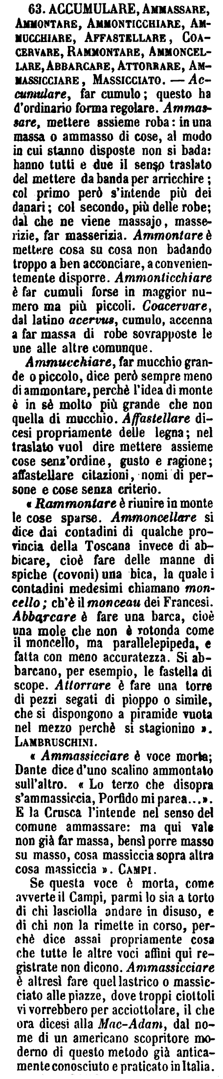 Se questa voce è morta, come avverte il Campi, parmi lo sia a torto di chi lasciolla andare in disuso, e di chi non la rimette in corso, perchè dice assai propriamente cosa che tutte le altre voci affini qui registrate non dicono. Ammassicciare è altresì fare quel lastrico o massicciato alle piazze, dove troppi ciottoli vi vorrebbero per acciottolare, il che ora dicesi alla Mac-Adam, dal nome di un americano scopritore moderno di questo metodo già anticamente conosciuto e praticato in Italia. [immagine] |