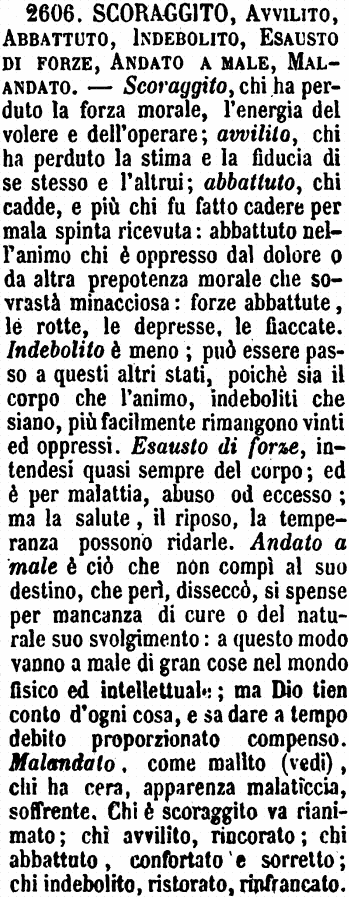 | Scoraggito, Avvilito, Abbattuto, Indebolito, Esausto di forze, Andato a male, Malandato - Scoraggito, chi ha perduto la forza morale, l'energia del volere e dell'operare; avvilito, chi ha perduto la stima e la fiducia di se stesso e l'altrui; abbattuto, chi cadde, e più chi fu fatto cadere per mala spinta ricevuta: abbattuto nell'animo chi è oppresso dal dolore o da altra prepotenza morale che sovrastà minacciosa: forze abbattute, le rotte, le depresse, le fiaccate. Indebolito è meno; può essere passo a questi altri stati, poichè sia il corpo che l'animo, indeboliti che siano, più facilmente rimangono vinti ed oppressi. Esausto di forze, intendesi quasi sempre del corpo; ed è per malattia, abuso od eccesso; ma la salute, il riposo, la temperanza possono ridarle. Andato a male è ciò che non compì al suo destino, che perì, disseccò, si spense per mancanza di cure o del naturale suo svolgimento: a questo modo vanno a male di gran cose nel mondo fisico ed intellettuale; ma Dio tien conto d'ogni cosa, e sa dare a tempo debito proporzionato compenso. Malandato, come malito (vedi), chi ha cera, apparenza malaticcia, soffrente. Chi è scoraggito va rianimato; chi avvilito, rincorato; chi abbattuto, confortato e sorretto; chi indebolito, ristorato, rinfrancato. [immagine] |