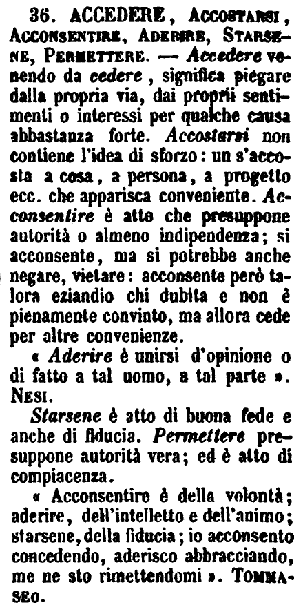 | Accedere, Accostarsi, Acconsentire, Aderire, Starsene, Permettere - Accedere venendo da cedere, significa piegare dalla propria via, dai proprii sentimenti o interessi per qualche causa abbastanza forte. Accostarsi non contiene l'idea di sforzo: un s'accosta a cosa, a persona, a progetto ecc. che apparisca conveniente. Acconsentire è atto che presuppone autorità o almeno indipendenza; si acconsente, ma si potrebbe anche negare, vietare: acconsente però talora eziandio chi dubita e non è pienamente convinto, ma allora cede per altre convenienze.
