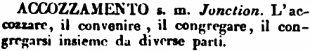 | Accozzamento - s. m. Jonction. L'accozzare, il convenire, il congregare, il congregarsi insieme da diverse parti. [immagine] |