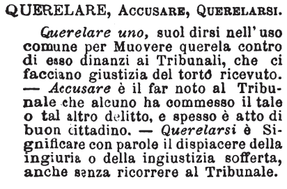 | Querelare, Accusare, Querelarsi - Querelare uno, suol dirsi nell'uso comune per Muovere querela contro di esso dinanzi ai Tribunali, che ci facciano giustizia del torto ricevuto. - Accusare è il far noto al Tribunale che alcuno ha commesso il tale o tal altro delitto, e spesso è atto di buon cittadino. - Querelarsi è Significare con parole di dispiacere della ingiuria o della ingiustizia sofferta, anche senza ricorrere al Tribunale. [immagine] |
