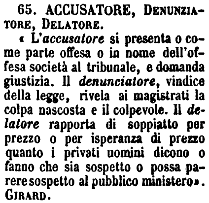 | Accusatore, Denunziatore, Delatore - « L'accusatore si presenta o come parte offesa o in nome dell'offesa società al tribunale, e domanda giustizia. Il denunciatore, vindice della legge, rivela ai magistrati la colpa nascosta e il colpevole. Il delatore rapporta di soppiatto per prezzo o per isperanza di prezzo quanto i privati uomini dicono o fanno che sia sospetto o possa parere sospetto al pubblico ministero ». Girard. [immagine] |