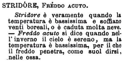 | Stridore, Freddo acuto - Stridore è veramente quando la temperatura è bassissima e soffiano venti boreali, o è caduta molta neve. - Freddo acuto si dice quando nell'inverno il cielo è sereno, ma la temperatura è bassissima, per il che il freddo penetra, come suol dirsi, nelle ossa. [immagine] |
