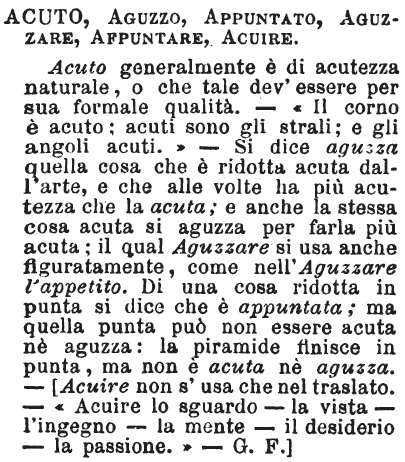 | Acuto, Aguzzo, Appunto, Aguzzare, Appuntare, Acuire - Acuto generalmente è di acutezza naturale, o che tale dev’essere per sua formale qualità. - «Il corno è acuto; acuti sono gli strali; e gli angoli acuti.» - Si dice aguzza quella cosa che è ridotta acuta dall’arte, a che alle volte ha più acutezza che la acuta; e anche la stessa cosa acuta si aguzza per farla più acuta; il qual Aguzzare si usa anche figuratamente, come nell’Aguzzare l’appetito. Di una cosa ridotta in punta si dice che è appuntata; ma quella punta può non essere acuta nè aguzza: la piramide finisce in punta, ma non è acuta nè aguzza. – [Acuire non s’usa che nel traslato. - «Acuire lo sguardo – la vista – l’ingegno – la mente – il desiderio – la passione.» - G. F. ] [immagine] |